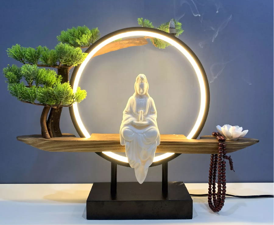 Tượng Phật Bà Quan Âm vòng đèn LED sáng đốt trầm hương